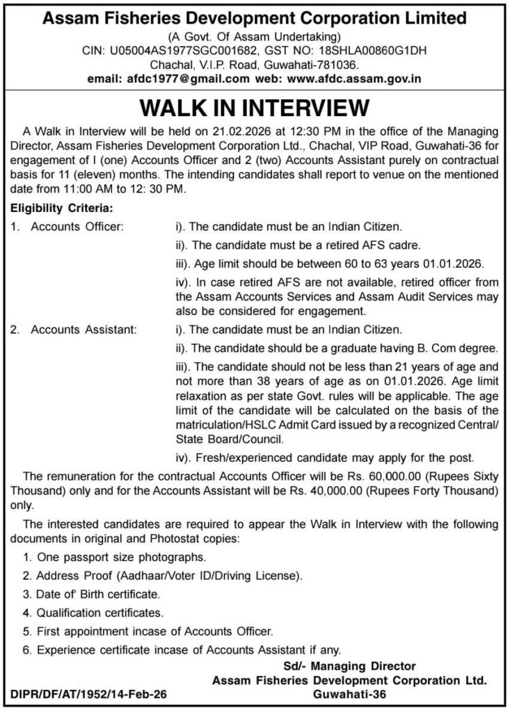 AFDC Recruitment 2026: অসম মীন উন্নয়ন নিগমত একাউণ্টছ অফিচাৰ আৰু এচিষ্টেণ্টৰ নিযুক্তি; জানক সাক্ষাৎকাৰৰ সবিশেষ।