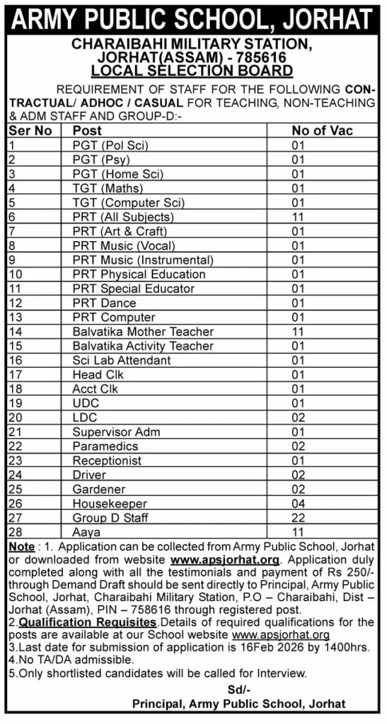 যোৰহাট আৰ্মী পাব্লিক স্কুলত চাকৰিৰ সুযোগ! শিক্ষকৰ পৰা গ্ৰুপ-ডি লৈকে ২৮ বিধ বিভিন্ন পদৰ বাবে আবেদন আহ্বান