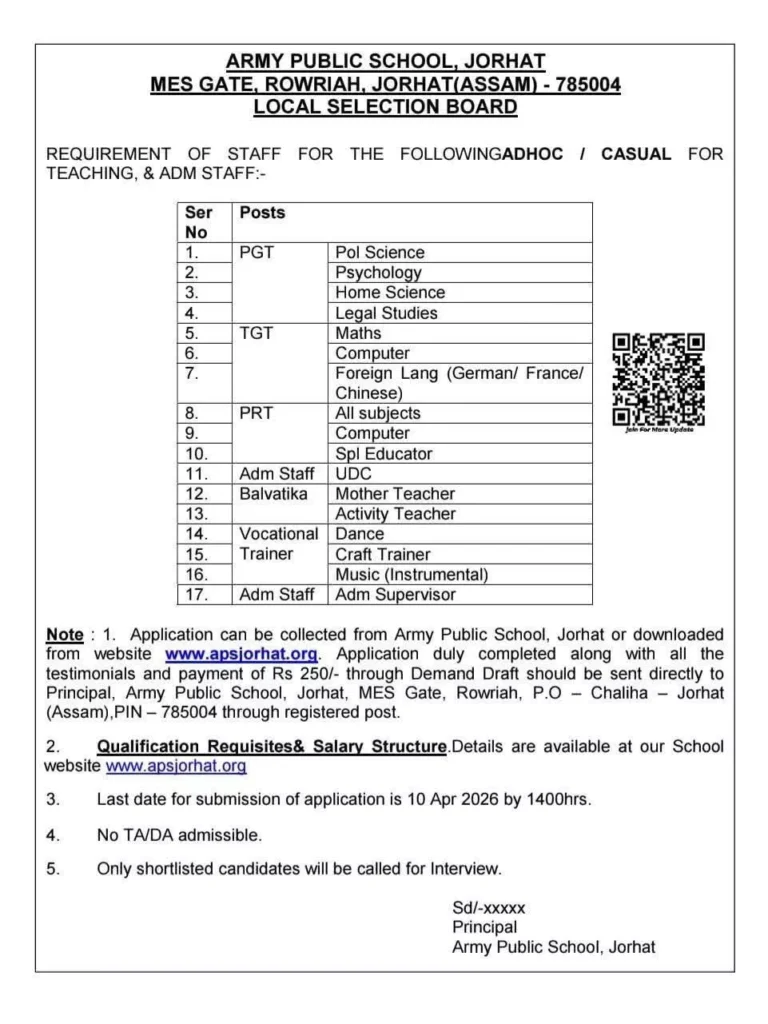 Army Public School Jorhat Recruitment 2026 ৰ বাবে আবেদন কৰিবলৈ প্ৰাৰ্থীৰ অৰ্হতা নিৰ্ধাৰিত নিয়ম অনুসৰি হ’ব লাগিব।