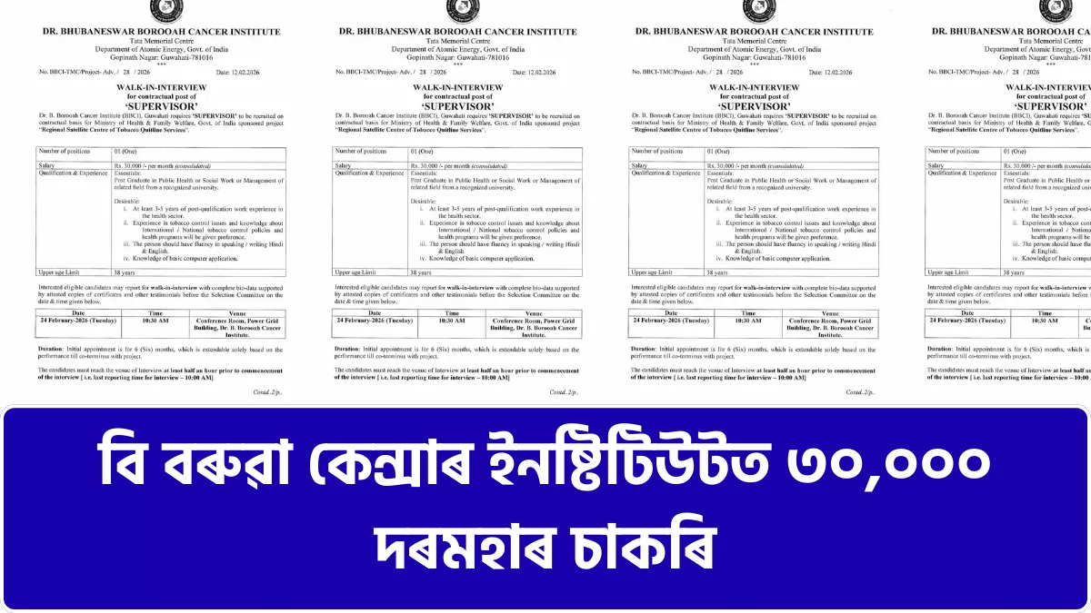 অসম বাতৰি (কেৰিয়াৰ): গুৱাহাটীৰ বিখ্যাত ড° বি বৰুৱা কেন্সাৰ ইনষ্টিটিউটে (BBCI) এক কেন্দ্ৰীয় চৰকাৰৰ পৃষ্ঠপোষকতাত চলা প্ৰকল্পৰ বাবে ঠিকাভিত্তিক চুপাৰভাইজাৰ (Supervisor) পদত নিযুক্তিৰ বাবে বিজ্ঞাপন প্ৰকাশ কৰিছে। এই নিযুক্তি “Regional Satellite Centre of Tobacco Quitline Services” নামৰ প্ৰকল্পটোৰ বাবে কৰা হ’ব।