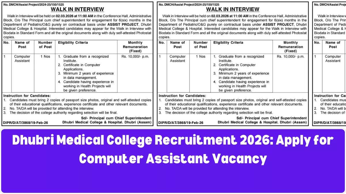 ধুবুৰী চিকিৎসা মহাবিদ্যালয় আৰু চিকিৎসালয় (DMCH)-এ শেহতীয়াকৈ Computer Assistant পদৰ বাবে এক নিযুক্তি জাননী মুকলি কৰিছে। এই নিযুক্তি ‘ASSIST PROJECT’-ৰ অধীনত সম্পূৰ্ণ ঠিকাভিত্তিক ভাবে কৰা হ’ব। যদি আপুনি এজন স্নাতক ডিগ্ৰীধাৰী আৰু কম্পিউটাৰৰ জ্ঞান আছে, তেন্তে এই সুযোগ গ্ৰহণ কৰিব পাৰে। ​Dhubri Medical College Recruitment 2026 – Overview Organization Dhubri Medical College & Hospital (DMCH) … Read more