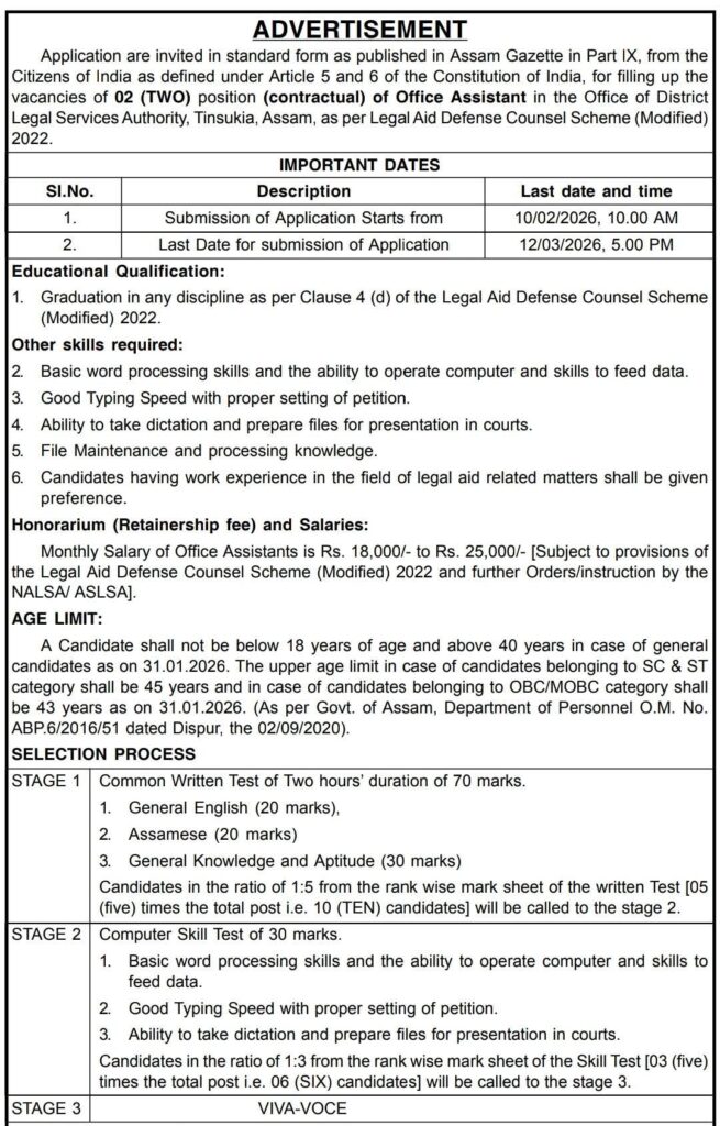 DLSA Tinsukia Recruitment 2026: তিনিচুকীয়া জিলা আইনী সেৱা প্ৰাধিকৰণত অফিচ এচিষ্টেণ্টৰ নিযুক্তি; জানক সবিশেষ।