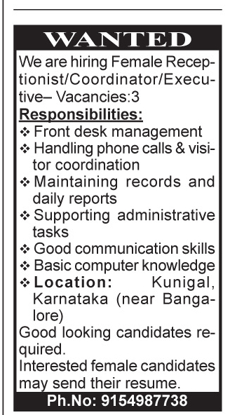 Receptionist / Coordinator / Executive০৩ টাকেৱল মহিলা (Female)কুনিগাল, কৰ্ণাটক (বেংগালুৰুৰ ওচৰত)