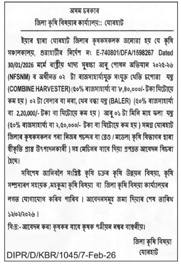 অসম বাতৰি (যোৰহাট): যোৰহাট জিলা কৃষি কাৰ্যালয়ে ‘নেচনেল ফুড চিকিউৰিটি এণ্ড নিউট্ৰিচন মিছন’ (NFSNM) ৰ অধীনত কৃষকসকলক উন্নত কৃষি যন্ত্ৰপাতি প্ৰদানৰ বাবে এক বৃহৎ পদক্ষেপ লৈছে। এই আঁচনিৰ অধীনত Combine Harvester আৰু Baler মেচিন ক্ৰয় কৰিলে কৃষকসকলে ৫০ শতাংশ পৰ্যন্ত ৰাজসাহায্য (Subsidy) লাভ কৰিব।আধুনিক কৃষি পদ্ধতিৰে উৎপাদন বৃদ্ধি আৰু শ্ৰম হ্ৰাস কৰাৰ লক্ষ্যৰে চৰকাৰে এই সুবিধা আগবঢ়াইছে।