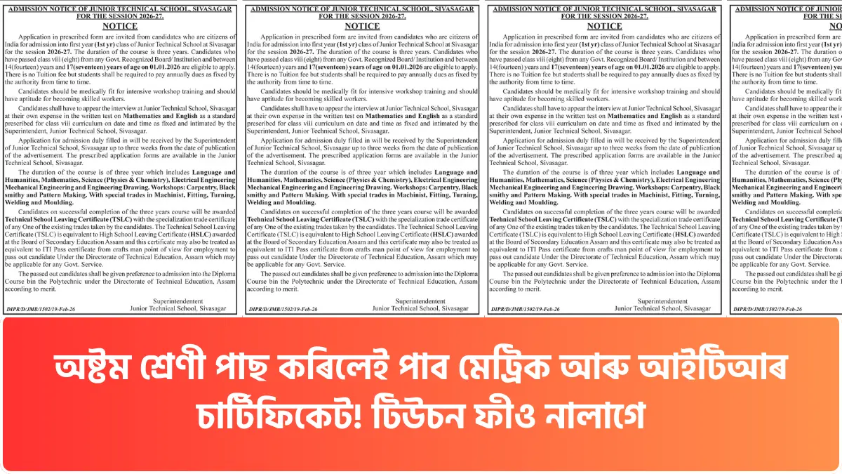 অসম বাতৰি (শিক্ষা): শিৱসাগৰস্থিত জুনিয়ৰ টেকনিকেল স্কুলে ২০২৬-২৭ শিক্ষাবৰ্ষৰ বাবে ৩ বছৰীয়া বিশেষ কাৰিকৰী পাঠ্যক্ৰমত নামভৰ্তিৰ জাননী প্ৰকাশ কৰিছে। যিসকল ছাত্ৰ-ছাত্ৰীয়ে অষ্টম শ্ৰেণী পাছ কৰাৰ পিছত কাৰিকৰী শিক্ষা লৈ স্বাৱলম্বী হ’ব বিচাৰে, তেওঁলোকৰ বাবে এইটো এক বিশেষ সুযোগ। এই পাঠ্যক্ৰমৰ আটাইতকৈ ডাঙৰ বিশেষত্ব হ’ল যে ইয়াৰ চাৰ্টিফিকেট মেট্ৰিক (HSLC) আৰু আইটিআৰ (ITI) সমপৰ্যায়ৰ।