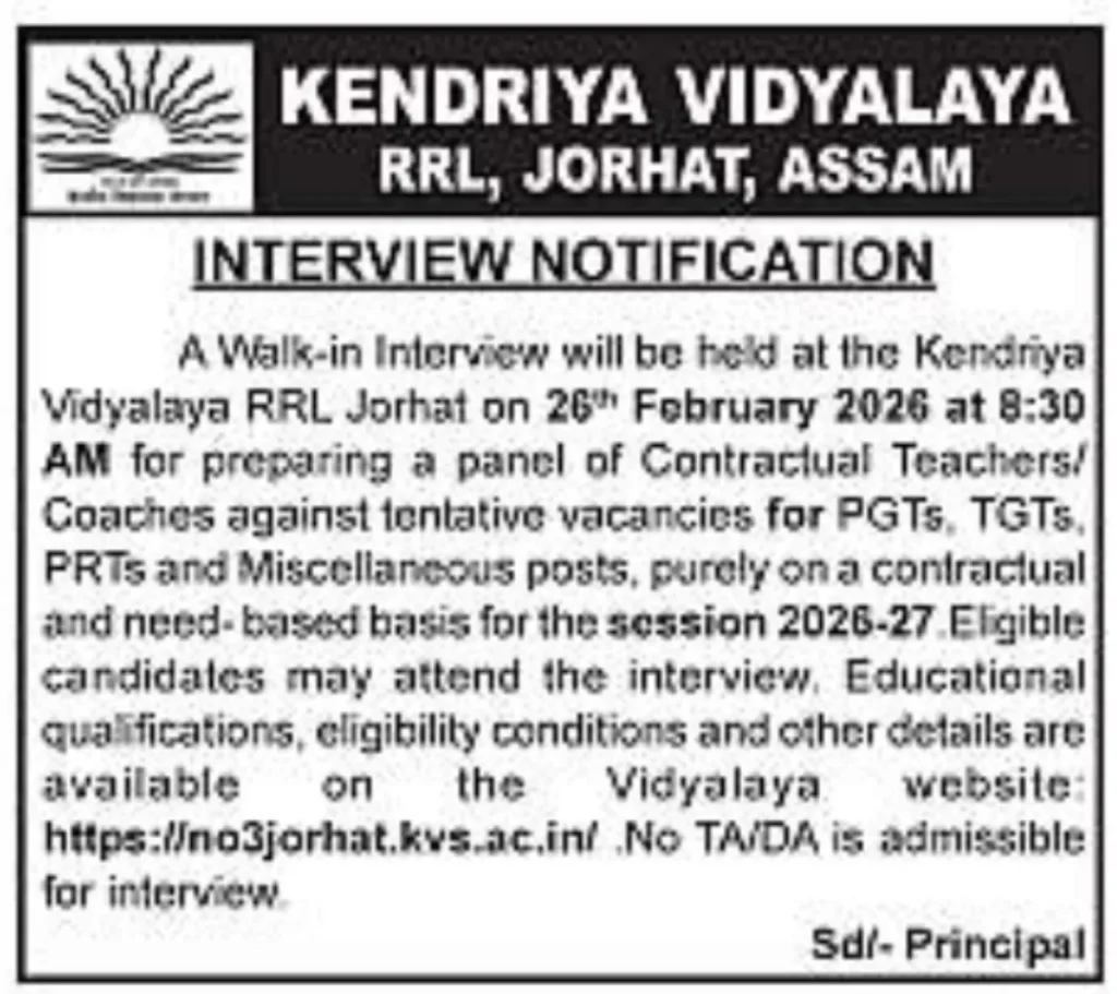 অসম বাতৰি (কেৰিয়াৰ): যোৰহাটৰ অন্যতম অগ্ৰণী শিক্ষানুষ্ঠান কেন্দ্ৰীয় বিদ্যালয় আৰ.আৰ.এল (KV RRL Jorhat)-এ ২০২৬-২৭ শিক্ষাবৰ্ষৰ বাবে বিভিন্ন শিক্ষক আৰু প্ৰশিক্ষকৰ এটা পেনেল প্ৰস্তুত কৰিবলৈ ৱাক-ইন-ইণ্টাৰভিউ (Walk-in-Interview) আহ্বান কৰিছে। এই নিযুক্তিসমূহ সম্পূৰ্ণৰূপে ঠিকাভিত্তিক আৰু প্ৰয়োজন সাপেক্ষে (Contractual & Need-based) হ’ব।