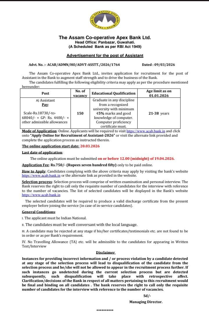 Assam Apex Bank Assistant Recruitment 2026: এপেক্স বেংকত ১৫০টা এছিষ্টেণ্ট পদত নিযুক্তি; কেনেকৈ আবেদন কৰিব জানক!