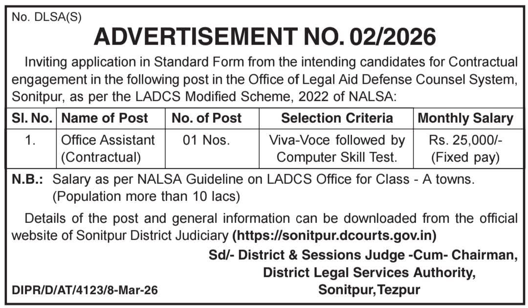DLSA Sonitpur Recruitment 2026: শোণিতপুৰ জিলা আইনী সেৱা প্ৰাধিকৰণত নিযুক্তি; মাহিলী ২৫,০০০ টকা দৰমহাত অফিচ এছিষ্টেণ্টৰ পদ খালী!