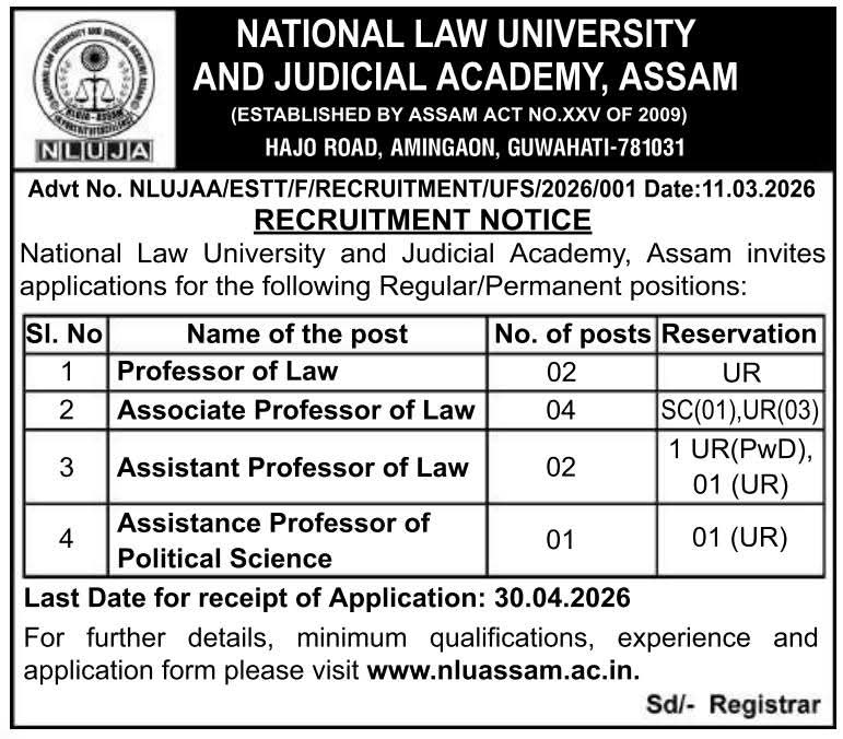 ​অসম কেৰিয়াৰ (গুৱাহাটী): গুৱাহাটীৰ আমিনগাঁৱত অৱস্থিত নেচনেল ল ইউনিভাৰ্চিটি এণ্ড জুডিচিয়েল একাডেমী (NLUJAA)-এ বিভিন্ন বিষয়ৰ ফেকাল্টী পদত নিযুক্তিৰ বাবে বিজ্ঞাপন প্ৰকাশ কৰিছে। এই নিযুক্তি সম্পূৰ্ণৰূপে নিয়মীয়া বা স্থায়ী (Regular/Permanent) ভিত্তিত হ’ব। যোগ্য প্ৰাৰ্থীসকলে ৩০ এপ্ৰিল ২০২৬-ৰ ভিতৰত আবেদন প্ৰক্ৰিয়া সম্পূৰ্ণ কৰিব লাগিব। ​পদৰ সবিশেষ (Post & Vacancy Details) ​মুঠ ৯টা খালী পদৰ বাবে এই নিযুক্তি … Read more