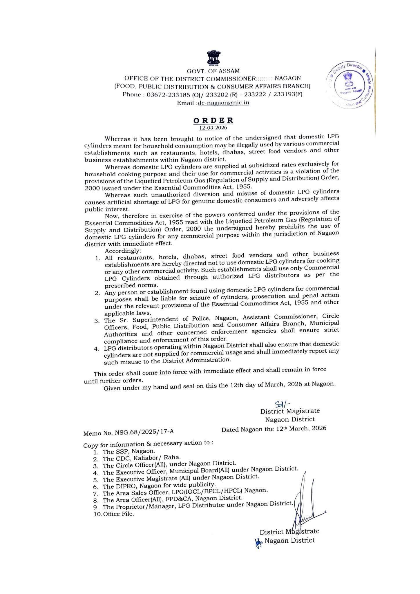 ​অসম কেৰিয়াৰ (নগাঁও): নগাঁও জিলাৰ যিসকল ব্যৱসায়ীয়ে বাণিজ্যিক কামত ঘৰুৱা এলপিজি (Domestic LPG) চিলিণ্ডাৰ ব্যৱহাৰ কৰি আছে, তেওঁলোকলৈ সতৰ্কবাণী! নগাঁও জিলা দণ্ডাধীশৰ এক শেহতীয়া নিৰ্দেশ মৰ্মে এতিয়াৰে পৰা হোটেল, ৰেষ্টুৰেণ্ট, ধাবা আৰু পথৰ কাষৰ দোকানসমূহত ঘৰুৱা চিলিণ্ডাৰ ব্যৱহাৰ কৰাটো সম্পূৰ্ণৰূপে নিষিদ্ধ কৰা হৈছে। এই নিৰ্দেশ অমান্য কৰিলে কঠোৰ আইনী ব্যৱস্থা গ্ৰহণ কৰা হ’ব। ​নিৰ্দেশনাটোৰ মূল … Read more