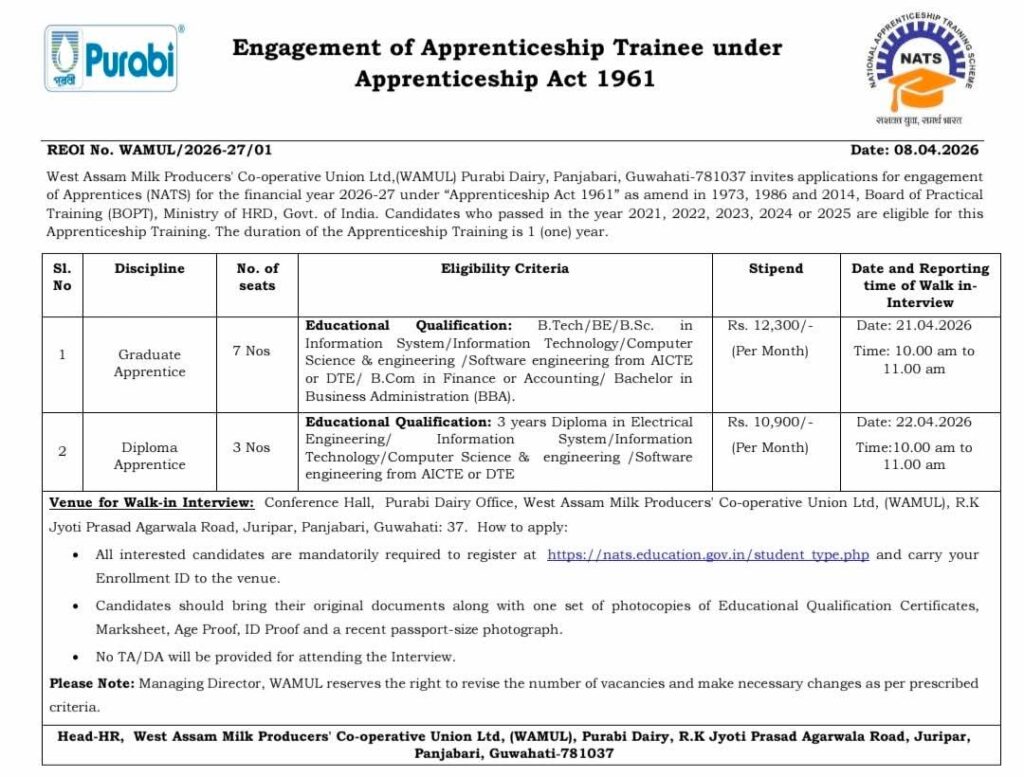 অসমৰ শিক্ষিত নিবনুৱা যুৱক-যুৱতীসকলৰ বাবে এটা সুন্দৰ খবৰ। পশ্চিম অসম দুগ্ধ উৎপাদক সমবায় ইউনিয়ন লিমিটেড (WAMUL), যিটো জনপ্ৰিয়ভাৱে ‘পুৰৱী ডেইৰী’ (Purabi Dairy) নামেৰে পৰিচিত, তেওঁলোকে ২০২৬ বৰ্ষৰ বাবে নতুন নিযুক্তিৰ জাননী মুকলি কৰিছে। Purabi Dairy Recruitment 2026 ৰ অধীনত বিভিন্ন বিভাগত এপ্ৰেন্টিচ শ্বিপ ট্ৰেইনিং (Apprenticeship Training) ৰ বাবে আবেদন আহ্বান কৰা হৈছে।