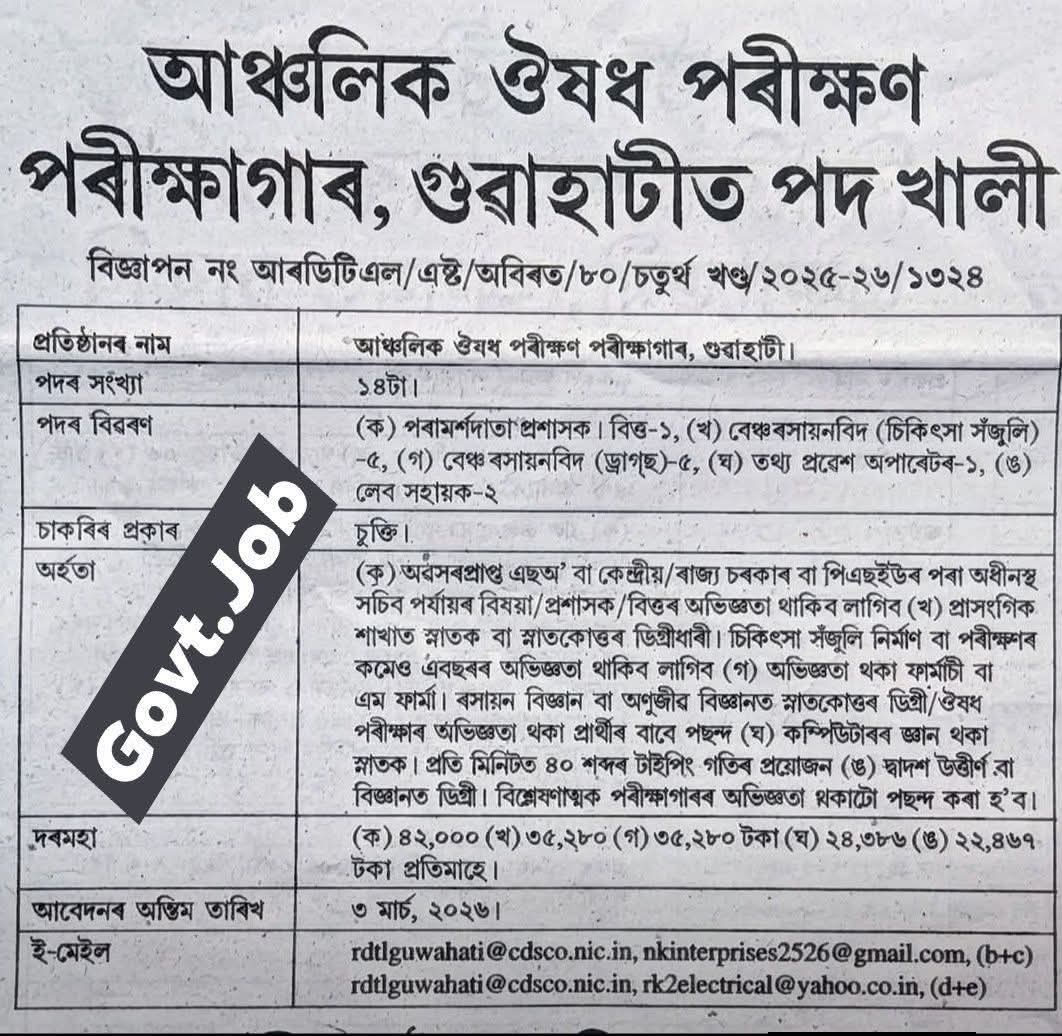 অসম বাতৰি (গুৱাহাটী): কেন্দ্ৰীয় ঔষধ মানদণ্ড নিয়ন্ত্ৰণ সংস্থাৰ (CDSCO) অধীনস্থ গুৱাহাটীৰ আঞ্চলিক ঔষধ পৰীক্ষণ গৱেষণাগাৰত (Regional Drug Testing Laboratory – RDTL) কেইবাটাও খালী পদ পূৰণৰ বাবে বিজ্ঞাপন প্ৰকাশ পাইছে। এই নিযুক্তি সম্পূৰ্ণ ঠিকাভিত্তিক (Contractual) আৰু যোগ্য প্ৰাৰ্থীসকলে ইমেইলৰ জৰিয়তে আবেদন কৰিব পাৰিব।