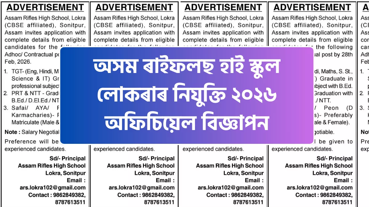 Assam Rifles High School Lokra Recruitment 2026: অসম ৰাইফলছ হাই স্কুলত শিক্ষক আৰু চতুৰ্থ বৰ্গৰ নিযুক্তি; জানক কেনেকৈ আবেদন কৰিব।