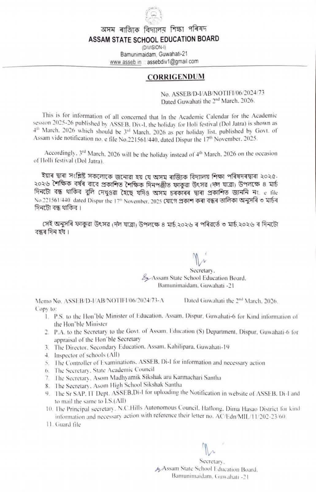 ASSEB Holi Holiday Correction 2026: অসমত ফাকুৱাৰ বন্ধৰ দিন সলনি; ৪ মাৰ্চৰ পৰিৱৰ্তে ৩ মাৰ্চতহে হ’ব ছুটি!