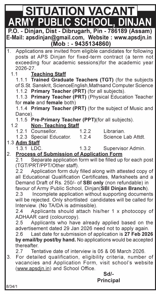 অসম বাতৰি (কেৰিয়াৰ): ডিব্ৰুগড় জিলাৰ দিনজানস্থিত আৰ্মী পাব্লিক স্কুলে (APS Dinjan) ২০২৬-২৭ শৈক্ষিক বৰ্ষৰ বাবে বিভিন্ন শিক্ষক (TGT, PRT, PPT) আৰু অ-শিক্ষক পদত নিযুক্তিৰ বাবে এক জাননী জাৰি কৰিছে। এই নিযুক্তি সম্পূৰ্ণ চুক্তিভিত্তিক (Fixed-term Contract) হ’ব। আগ্ৰহী প্ৰাৰ্থীসকলে অহা ২৭ ফেব্ৰুৱাৰীৰ ভিতৰত আবেদন জনাব পাৰিব। নিযুক্তিৰ সংক্ষিপ্ত বিৱৰণ (Overview Table) প্ৰতিষ্ঠানৰ নাম আৰ্মী পাব্লিক স্কুল, … Read more