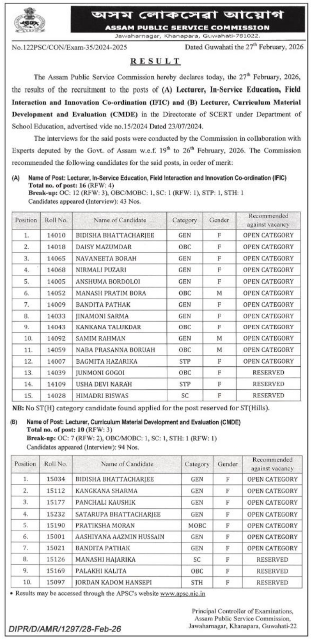 APSC SCERT Lecturer Result 2026: এপিএছচিৰ লেকচাৰাৰ (IFIC আৰু CMDE) পদৰ ফলাফল ঘোষণা; নিৰ্বাচিত প্ৰাৰ্থীৰ তালিকা ইয়াত চাওক!