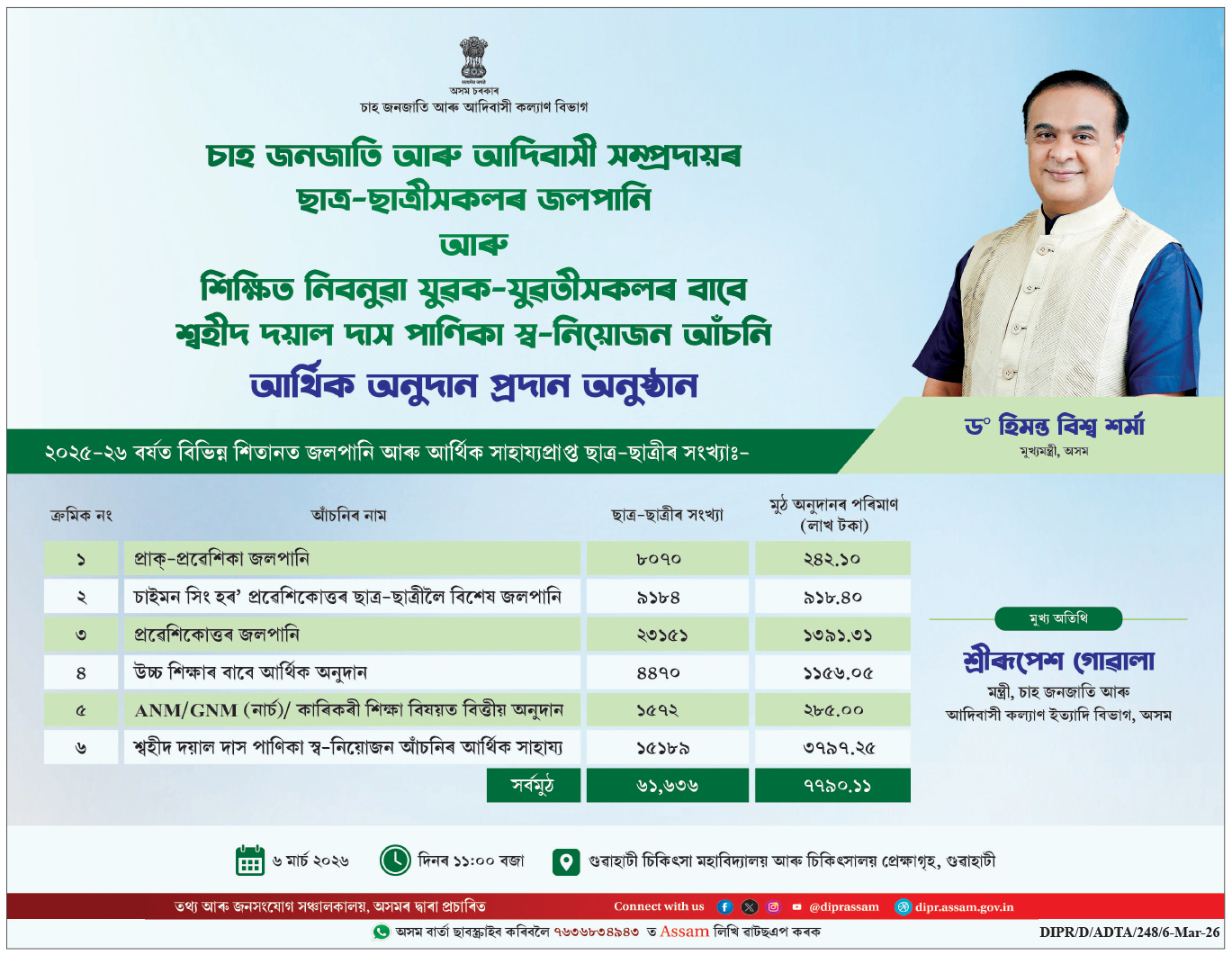 ​অসম বাতৰি (গুৱাহাটী): অসম চৰকাৰৰ চাহ জনজাতি আৰু আদিবাসী কল্যাণ বিভাগৰ উদ্যোগত আজি ৰাজ্যৰ এই দুই সম্প্ৰদায়ৰ ছাত্ৰ-ছাত্ৰী আৰু নিবনুৱা যুৱক-যুৱতীসকলৰ বাবে এক বিশাল আৰ্থিক সাহায্য আঁচনিৰ শুভাৰম্ভ কৰা হৈছে। গুৱাহাটী চিকিৎসা মহাবিদ্যালয় (GMCH) প্ৰেক্ষাগৃহত অনুষ্ঠিত এক গাম্ভীৰ্যপূৰ্ণ অনুষ্ঠানত মুখ্যমন্ত্ৰী ড° হিমন্ত বিশ্ব শৰ্মাই এই সাহায্য বিতৰণ কৰে। ​আঁচনি আৰু হিতাধিকাৰীৰ বিতং তথ্য (Beneficiaries Overview) … Read more