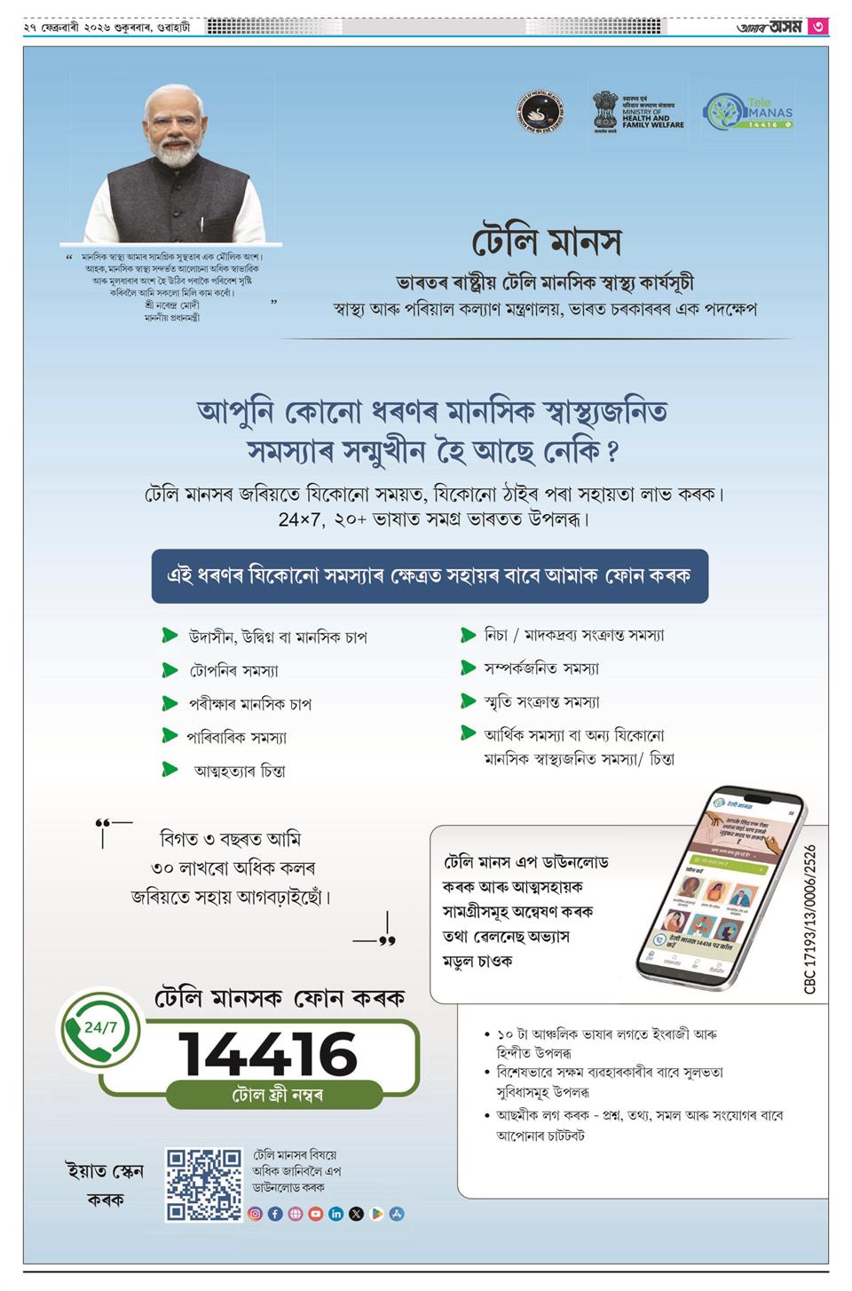 অসম বাতৰি: বৰ্তমানৰ ব্যস্ততাপূৰ্ণ জীৱনশৈলীত মানসিক স্বাস্থ্যৰ যত্ন লোৱাটো অত্যন্ত গুৰুত্বপূৰ্ণ হৈ পৰিছে। ভাৰত চৰকাৰৰ স্বাস্থ্য আৰু পৰিয়াল কল্যাণ মন্ত্ৰালয়ে নাগৰিকসকলৰ মানসিক সুৰক্ষাৰ বাবে এক বিশেষ ৰাষ্ট্ৰীয় টেলী-মানসিক স্বাস্থ্য সেৱা ‘Tele MANAS’ আৰম্ভ কৰিছে। এই সেৱাৰ জৰিয়তে যিকোনো ব্যক্তিয়ে ঘৰত বহিয়েই বিশেষজ্ঞৰ পৰা মানসিক পৰামৰ্শ আৰু সহায় ল’ব পাৰিব।