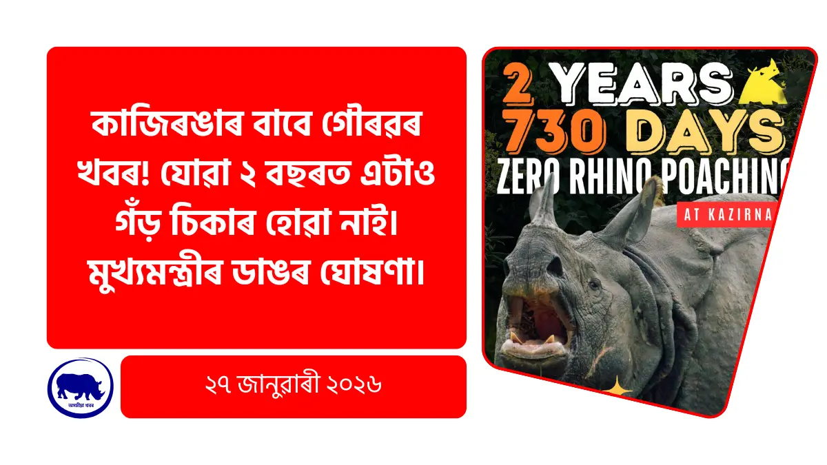 অসম বাতৰি: কাজিৰঙা ৰাষ্ট্ৰীয় উদ্যানৰ বাবে এক অতি আনন্দৰ খবৰ। ৰাজ্য চৰকাৰৰ কঠোৰ পদক্ষেপ আৰু বন বিভাগৰ নিৰন্তৰ নিৰীক্ষণৰ ফলত যোৱা ২ বছৰ অৰ্থাৎ ৭৩০ দিনত কাজিৰঙাত এটাও গঁড় চিকাৰ হোৱা নাই।মুখ্যমন্ত্ৰী ড০ হিমন্ত বিশ্ব শৰ্মাই সামাজিক মাধ্যমৰ জৰিয়তে এই সাফল্যৰ কথা প্ৰকাশ কৰি কয় যে য’ত ইচ্ছা থাকে তাতেই পথ থাক। কাজিৰঙাৰ গৌৰৱ এশিঙিয়া গঁড়ক সুৰক্ষিত কৰি ৰাখিবলৈ চৰকাৰে সকলো ধৰণৰ ব্যৱস্থা গ্ৰহণ কৰিছে। এইয়া কেৱল চৰকাৰৰেই নহয়, সমগ্ৰ অসমবাসীৰ বাবে এক ডাঙৰ গৌৰৱৰ বিষয়। তলত আপুনি গুৰুত্বপূৰ্ণ খৰব পঢ়িব পাৰিব।
